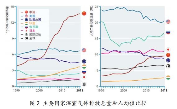 圖 2 主要國家溫室氣體排放總量和人均值比較