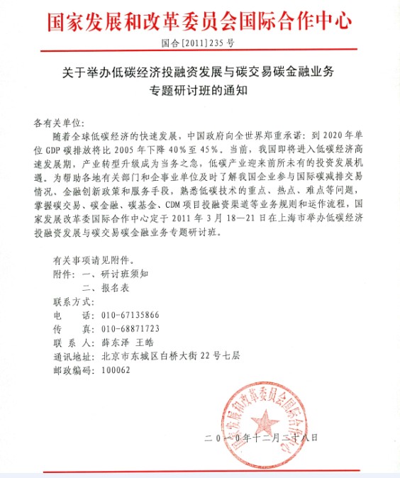 經(jīng)國(guó)家發(fā)改委國(guó)際合作中心授權(quán),現(xiàn)將國(guó)合【2011】235號(hào)文件關(guān)于2011年3月18日—21日在上海市舉辦“低碳經(jīng)濟(jì)投融資發(fā)展與碳交易碳金融業(yè)務(wù)專題研討班”通知轉(zhuǎn)發(fā)如下, 屆時(shí)將邀請(qǐng)國(guó)家發(fā)改委能源所、國(guó)務(wù)院發(fā)展研究中心、清華大學(xué)、財(cái)政部清潔發(fā)展機(jī)制基金管理中習(xí)等有關(guān)單位領(lǐng)導(dǎo)專家,現(xiàn)場(chǎng)授課交流,歡迎各會(huì)員單位報(bào)名參加。具體可與本站聯(lián)系方式中明確的郵件及電話聯(lián)系,也可直接與附件中會(huì)務(wù)組聯(lián)系。